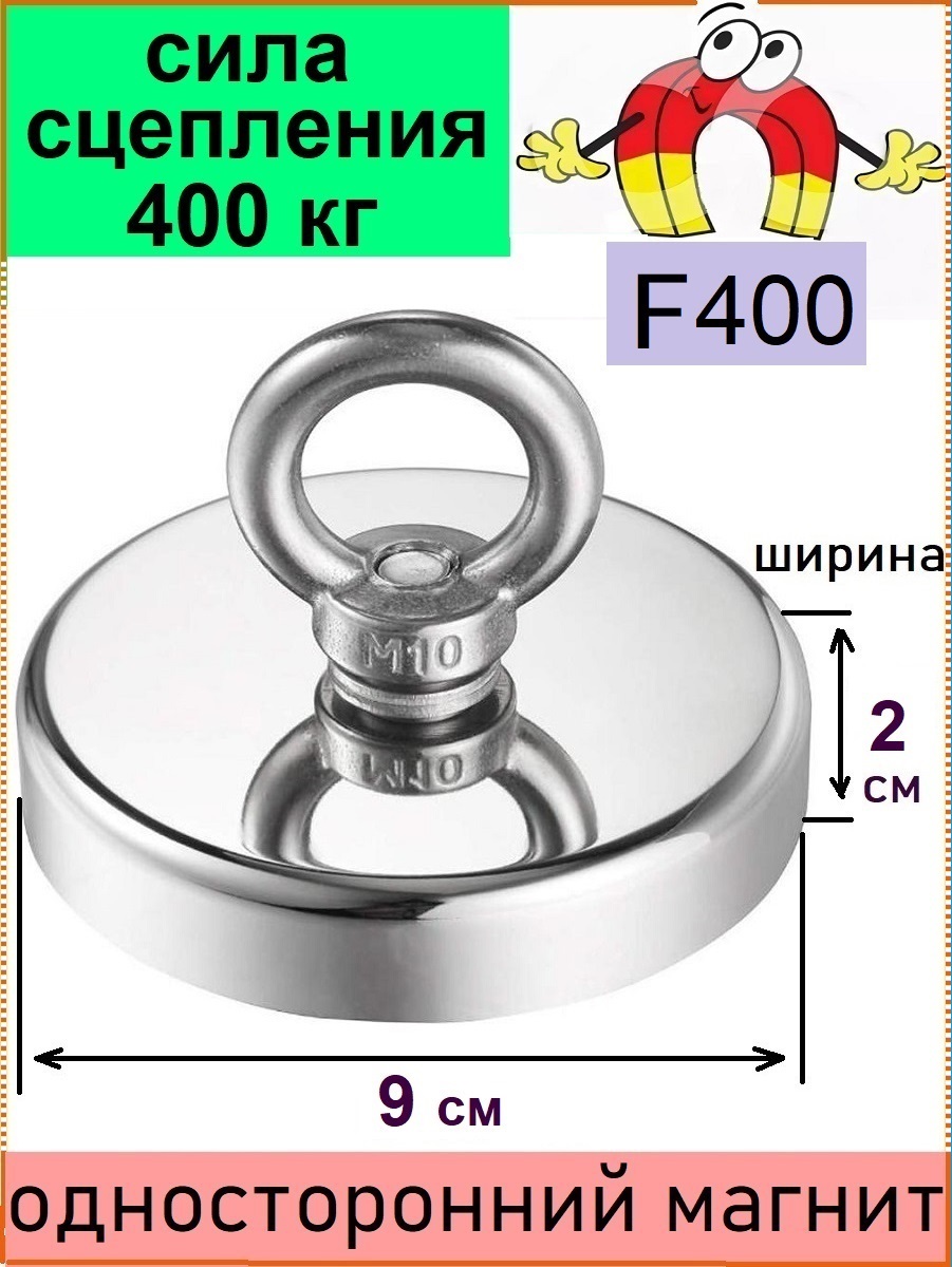 Поисковый магнит односторонний 400 кг, F400, неодимовый, размер 9 х 2 см