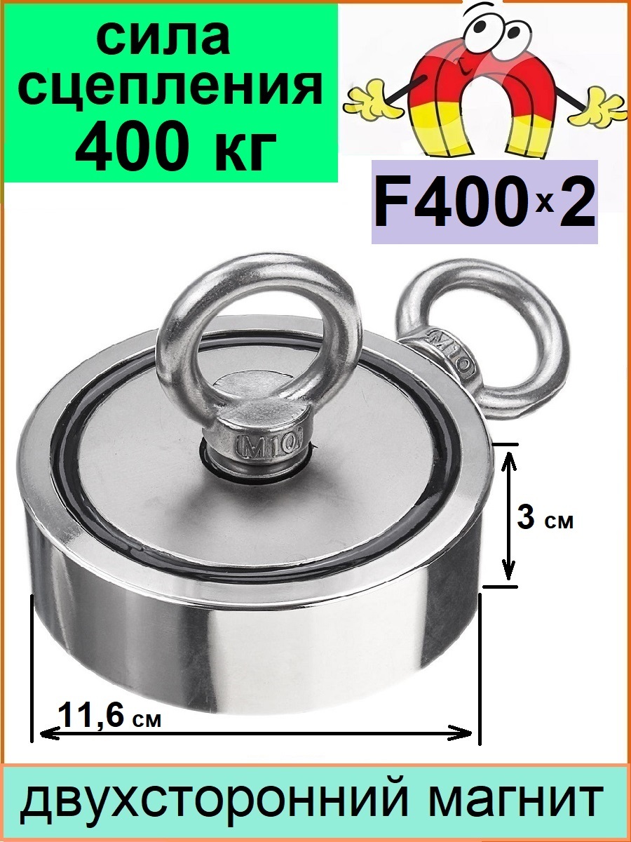 Поисковый магнит двухсторонний 400 кг, F400х2, неодимовый, размер 11,6 х 3 см