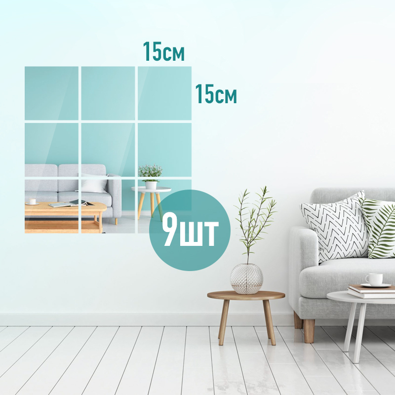 Набор 9шт - Зеркальная самоклеящаяся плёнка 15х15 см / плитка для стен и мебели в прихожую / кухню / ванную / гостиную