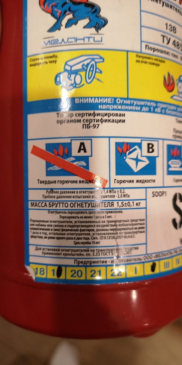 Огнетушитель автомобильный порошковый ОП1 STVOL SOOP1, 1,4 МПа