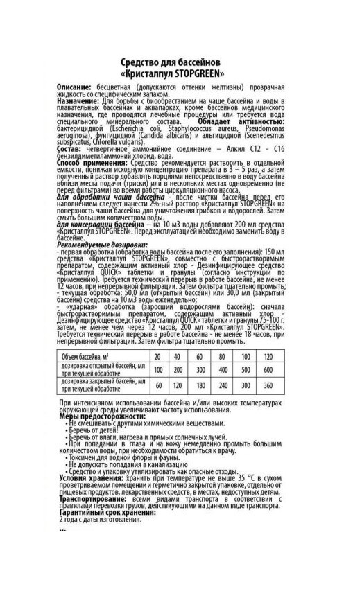 Альгицид для борьбы с био обрастанием.Уничтожает водоросли. Препятствует обрастанию стенок.Используется для консервации бассейна. Осветляет воду. Подходит для детских бассейнов.Способ применения: еженедельно. Текущая обработка: еженедельно. Ударная обрабо