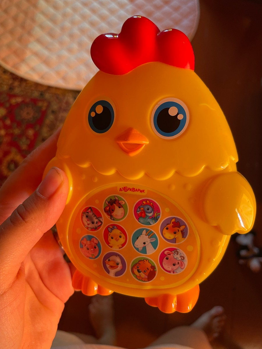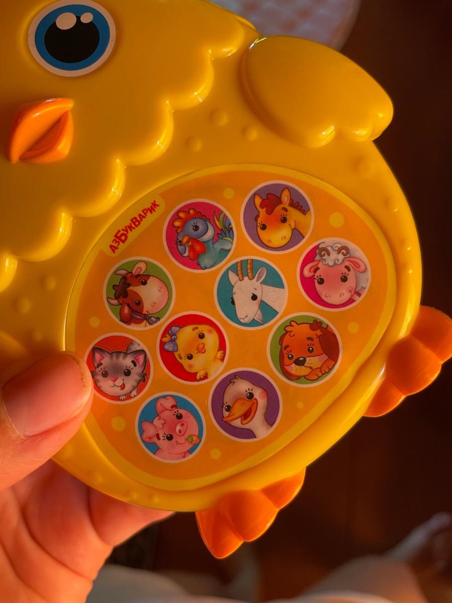 Яркий цыплёнок познакомит малышей с обитателями фермы!Нажимай на кнопочки - слушай голоса зверят, 30 песенок и мелодий ("Два весёлых гуся", "Кошкин дом", "Кто цыплёнка пожалеет", "Гули-гуленьки", "Лошадка", "Топ-топ, топотушки", "Гусь", "Полька", "Калинка