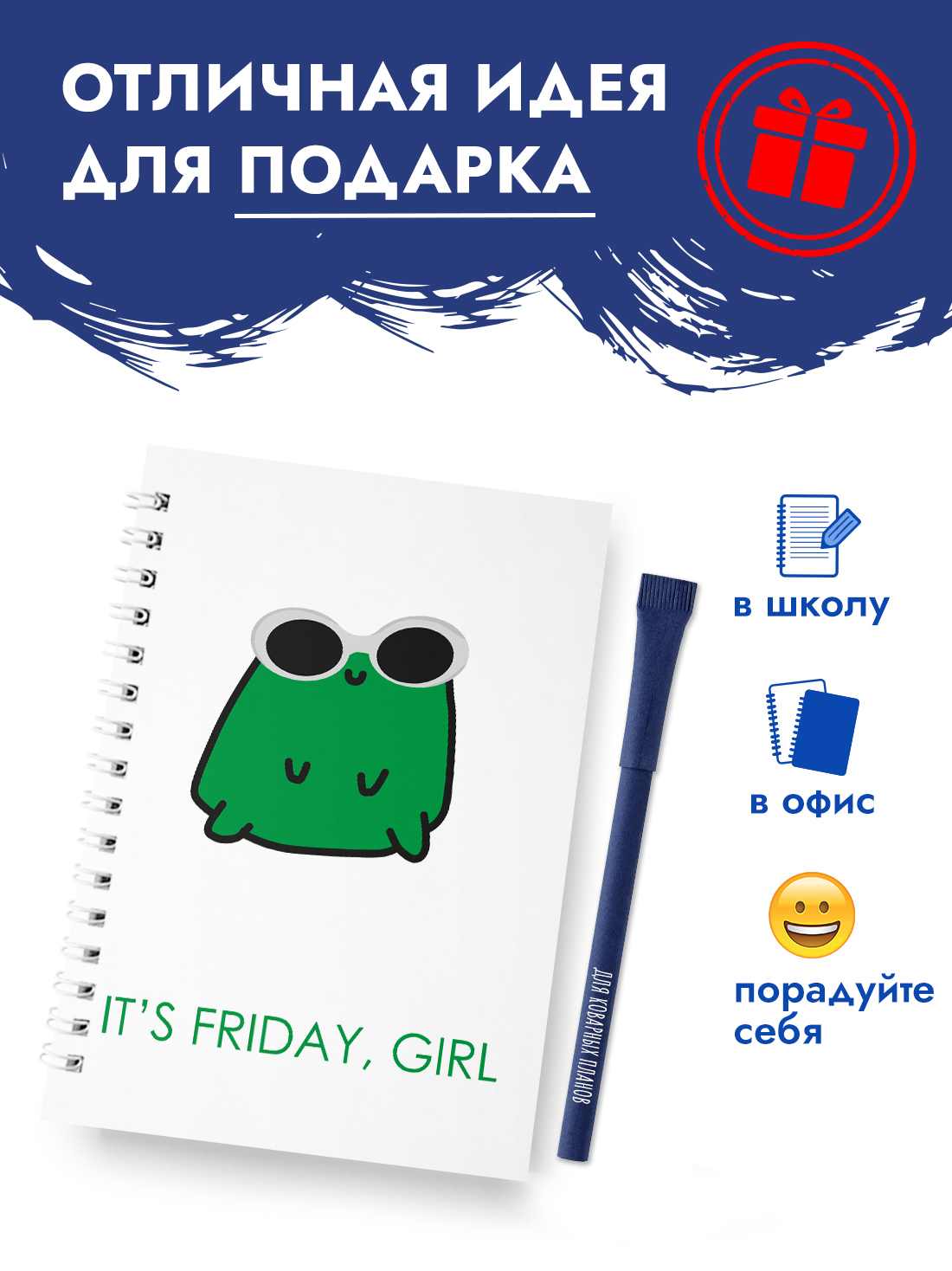 Уникальный дизайн блокнота и ручка в комплекте будут поднимать Вам настроение каждый день. Отлично подойдет в качестве подарка любимой, подруге, коллеге по работе или для личного пользования. 50 листов в клетку хватит для долгого использования.Комплектаци