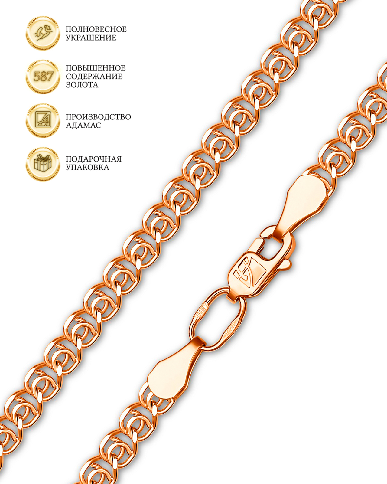 Создай уникальный комплект с цепочкой Артикул 234229921. Браслет производства "АДАМАС". Браслет полновесный Лав автоматного плетения из красного золота пробы. Артикул производителя БЛ150А2-А51. Для особого блеска на изделие нанесена алмазная огранка с дву