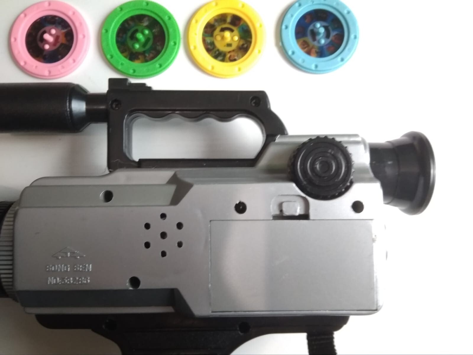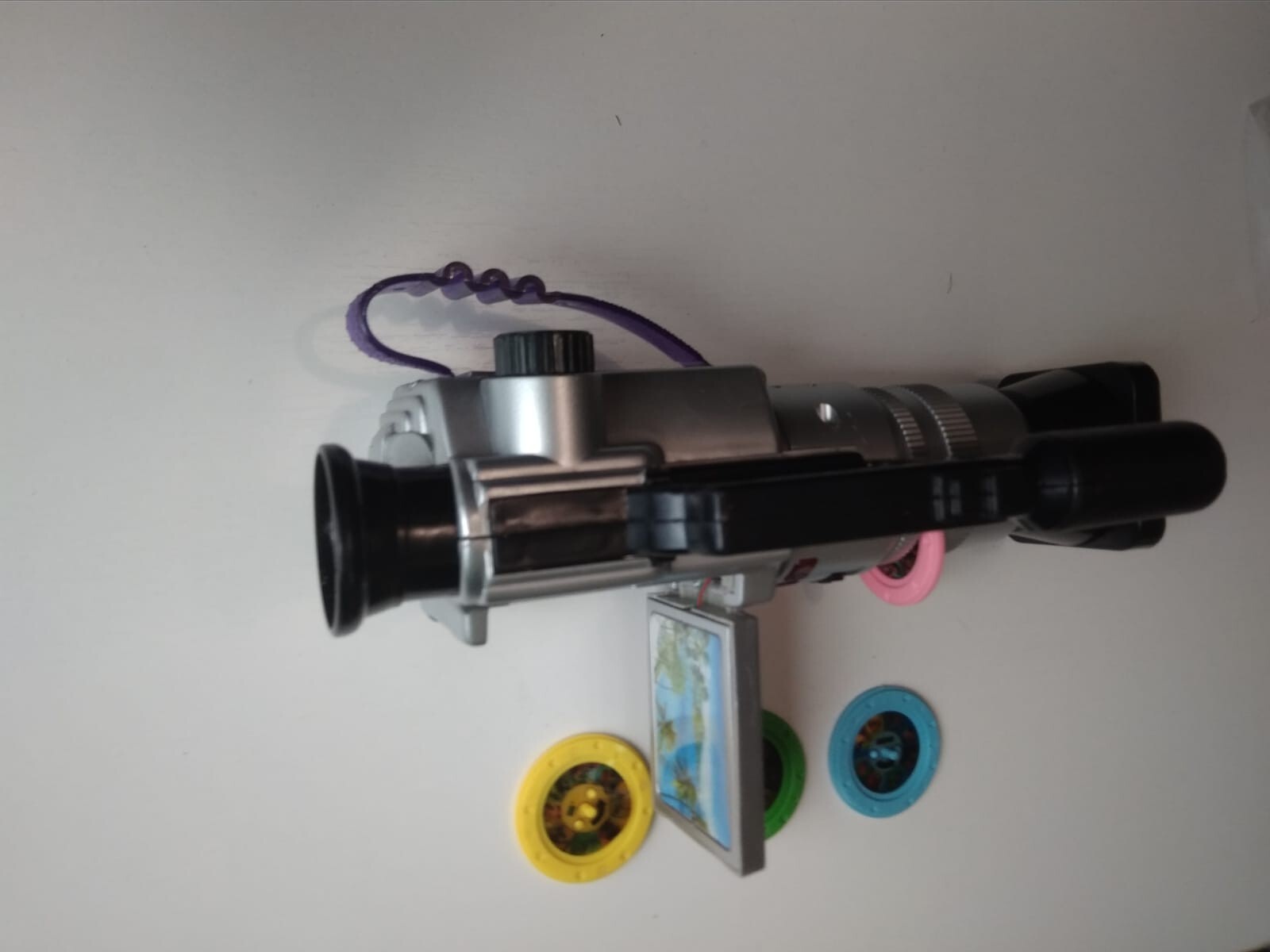 Детская Видеокамера состоит из встроенного слайда, который с помощью колесика на камере можно смотря в видеоискатель смотреть картинки, также можно вставить две батарейки АА2, и тогда нажимая на кнопки на камере будет звуковое сопровождение на китайском я