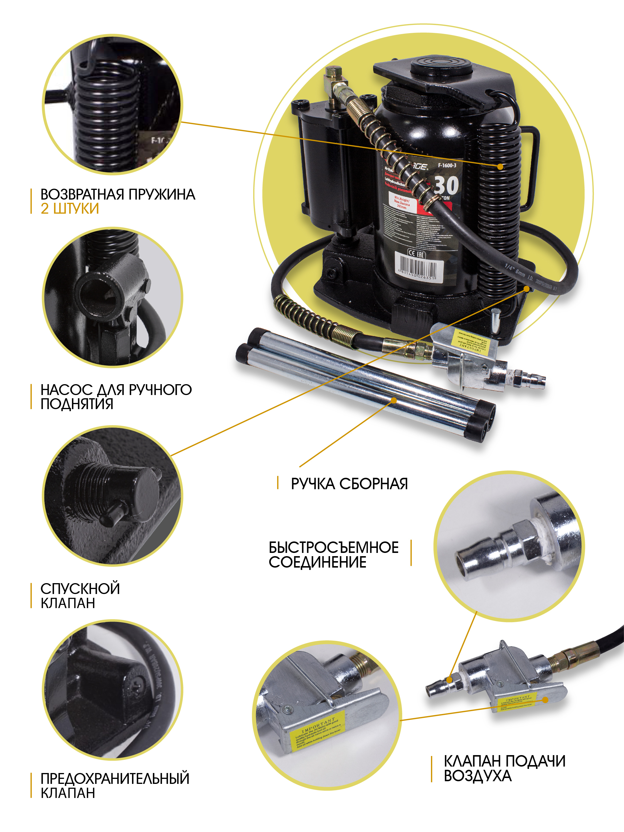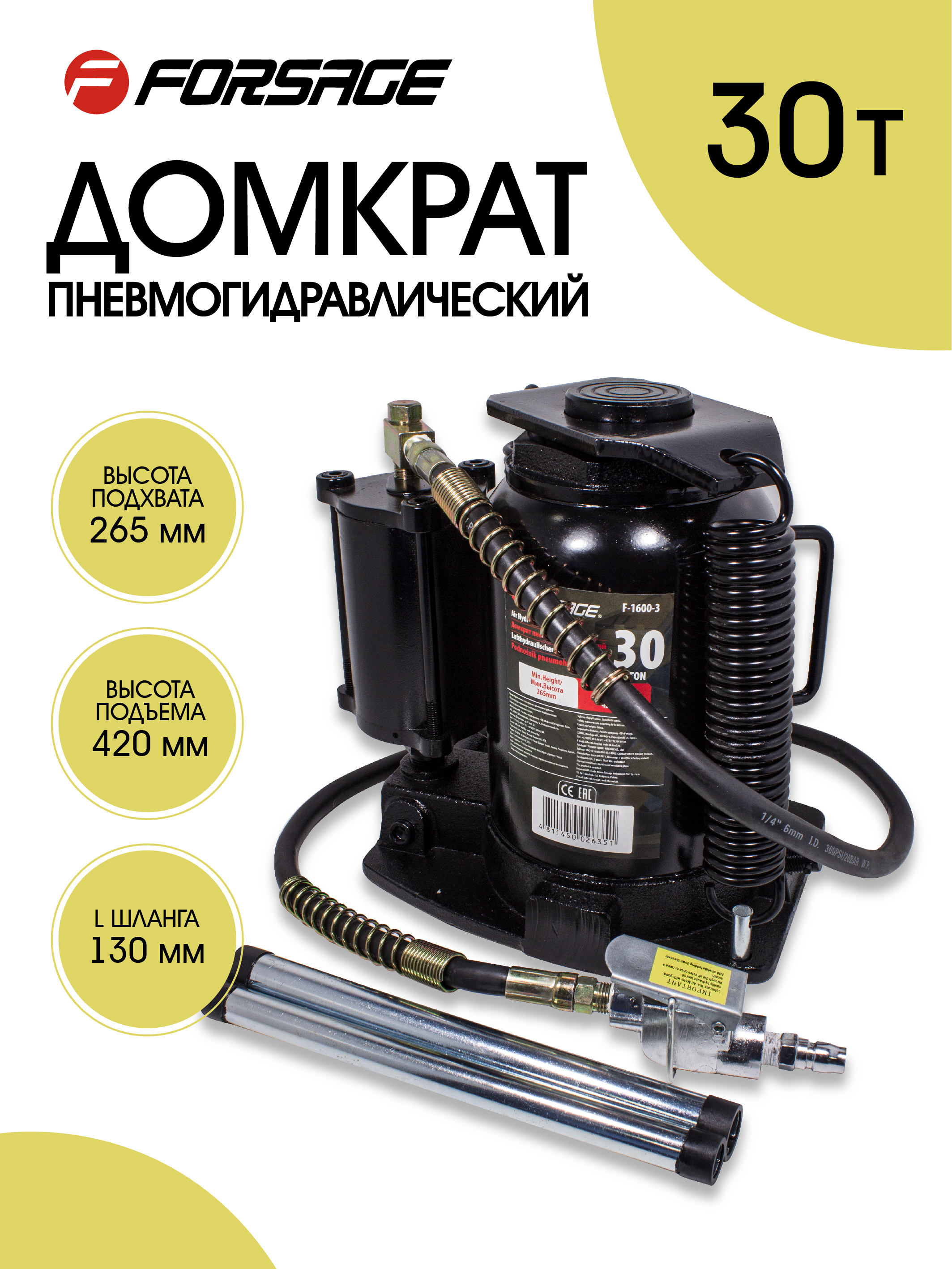 Домкрат пневмогидравлический 30т ход штока - 190мм, высота подхвата - 280мм, высота подъема - 470ммКомплектация:Домкрат пневмогидравлический 30т (ход штока - 190мм, высота подхвата - 280мм, высота подъема - 470мм)