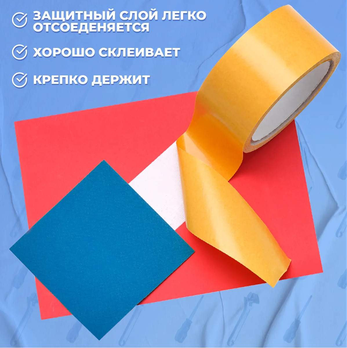 Клейкая лента двусторонняя монтажная белого цвета на тканевой основе с нанесенным с двух сторон клейким составом, изготовленным на основе синтетического каучука, наружный клеевой слой защищен силиконизированной бумажной полосой. Применяется при отделочных