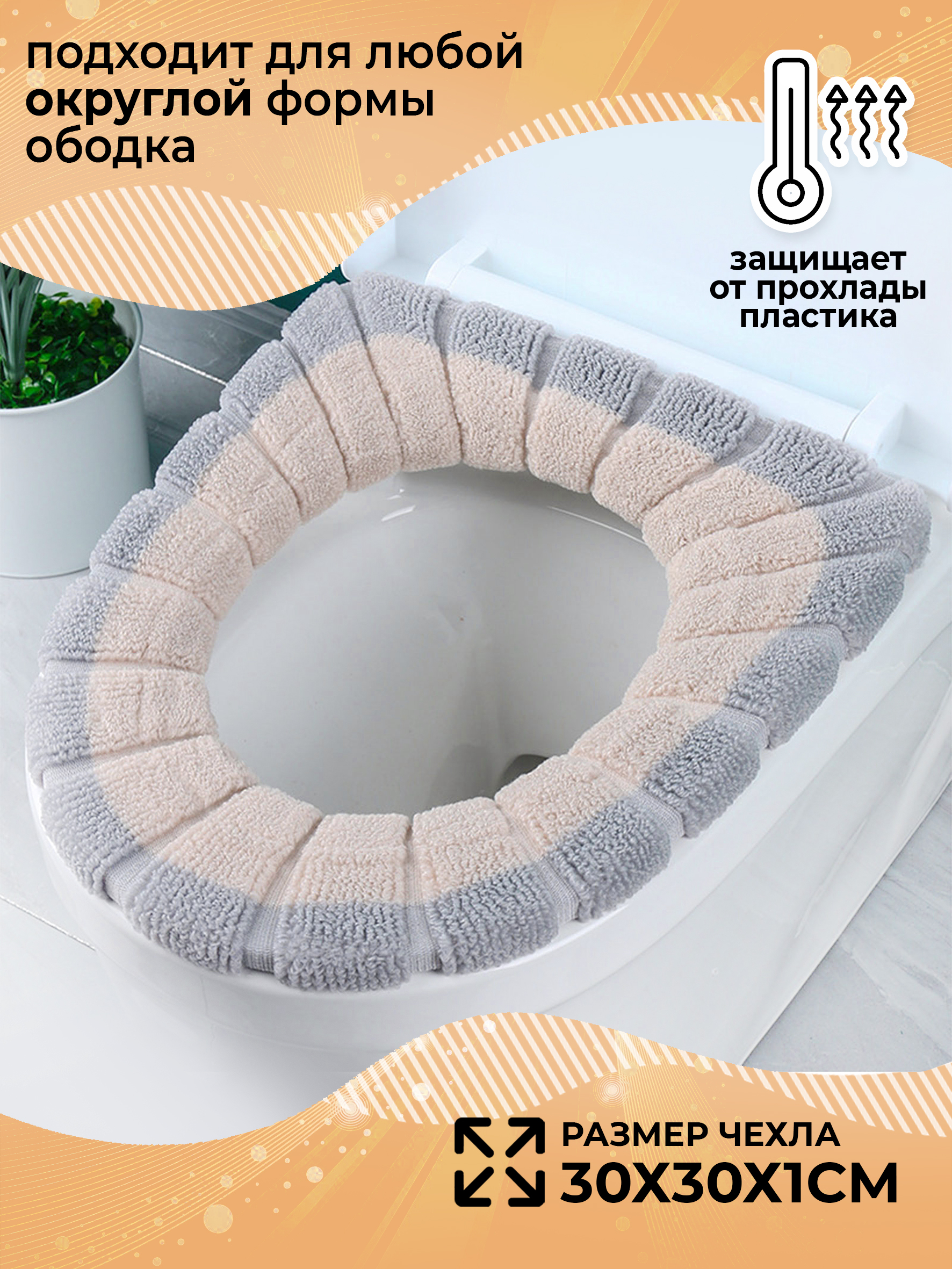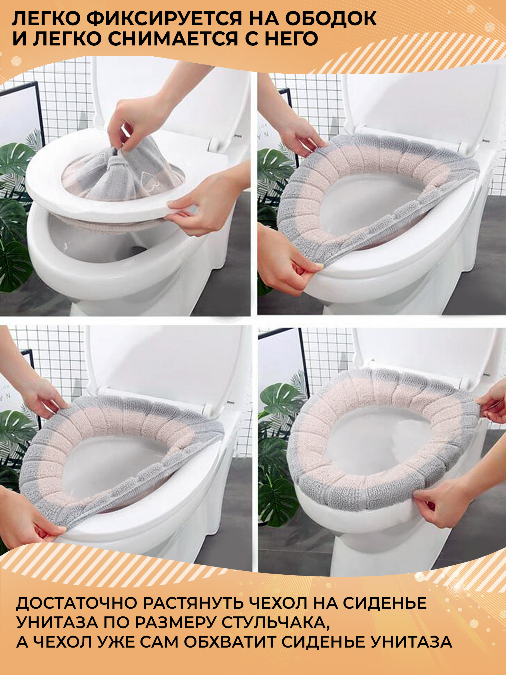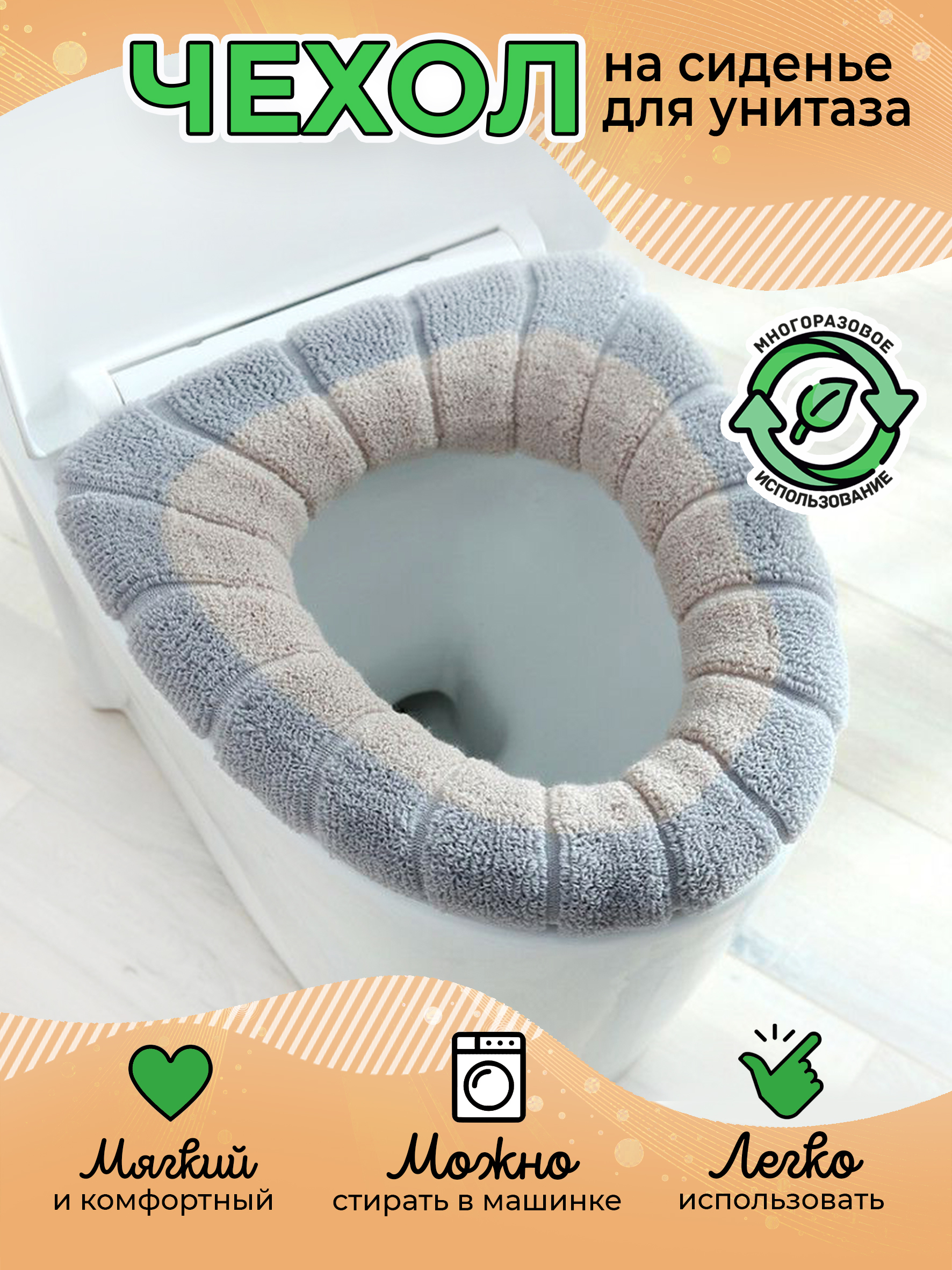 Комплектация:ободок для унитаза 1 штОписание:Чехол на сиденье для унитаза имеет стандартный размер. Накладка на унитаз легко снимается и надевается, а также подходит для многократных стирок в машинке. Крышка сиденье для унитаза не линяет и не садится, за
