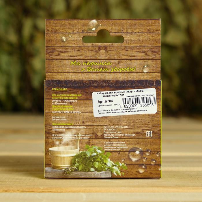 Состав:МаслоКомплектация:Набор эфирных масел "Кедр. Чабрец. Эвкалипт", 3 шт по 17 млОписание:Эфирное масло кедра - эффективный антисептик, оказывает обезболивающее, противовоспалительное действие, способствует шлаков из организма. Повышает умственную и фи