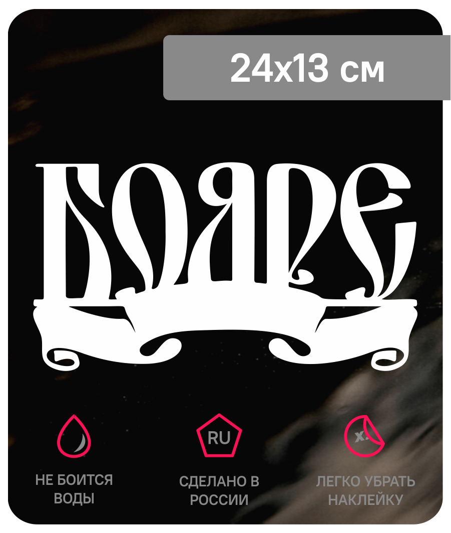 Виниловая наклейка на авто Бояре выполнена из матовой белой самоклеящейся виниловой пленки ORACAL641.Размер наклейки: 24х13 смНаклейка без фона (вырезана)Материал: виниловая пленкаНе боится воды и солнцаЛегко снимается с поверхности, не оставляя следов кл