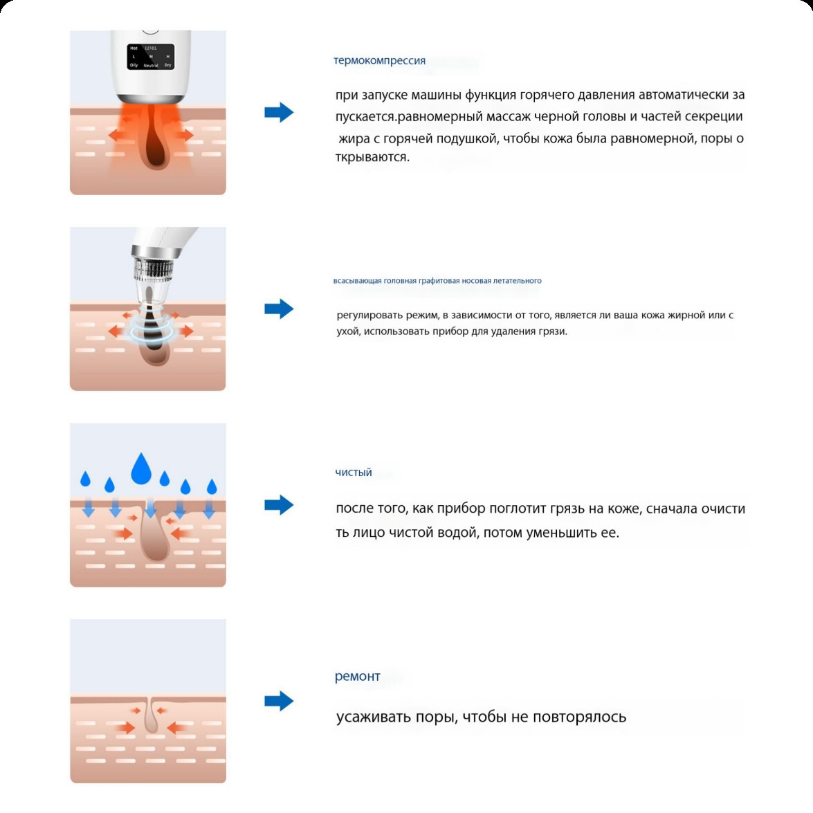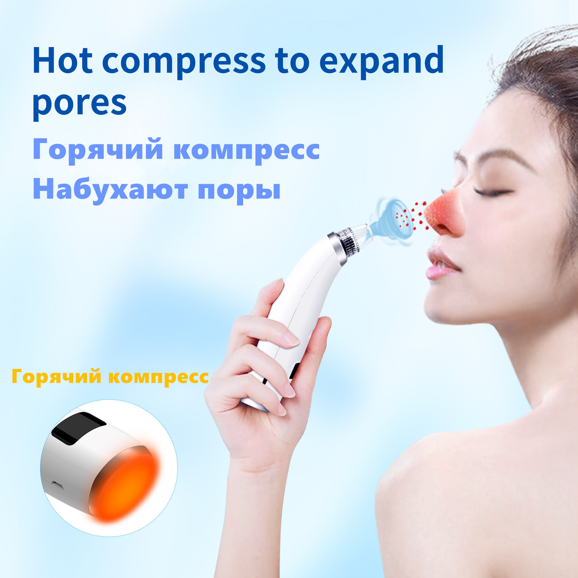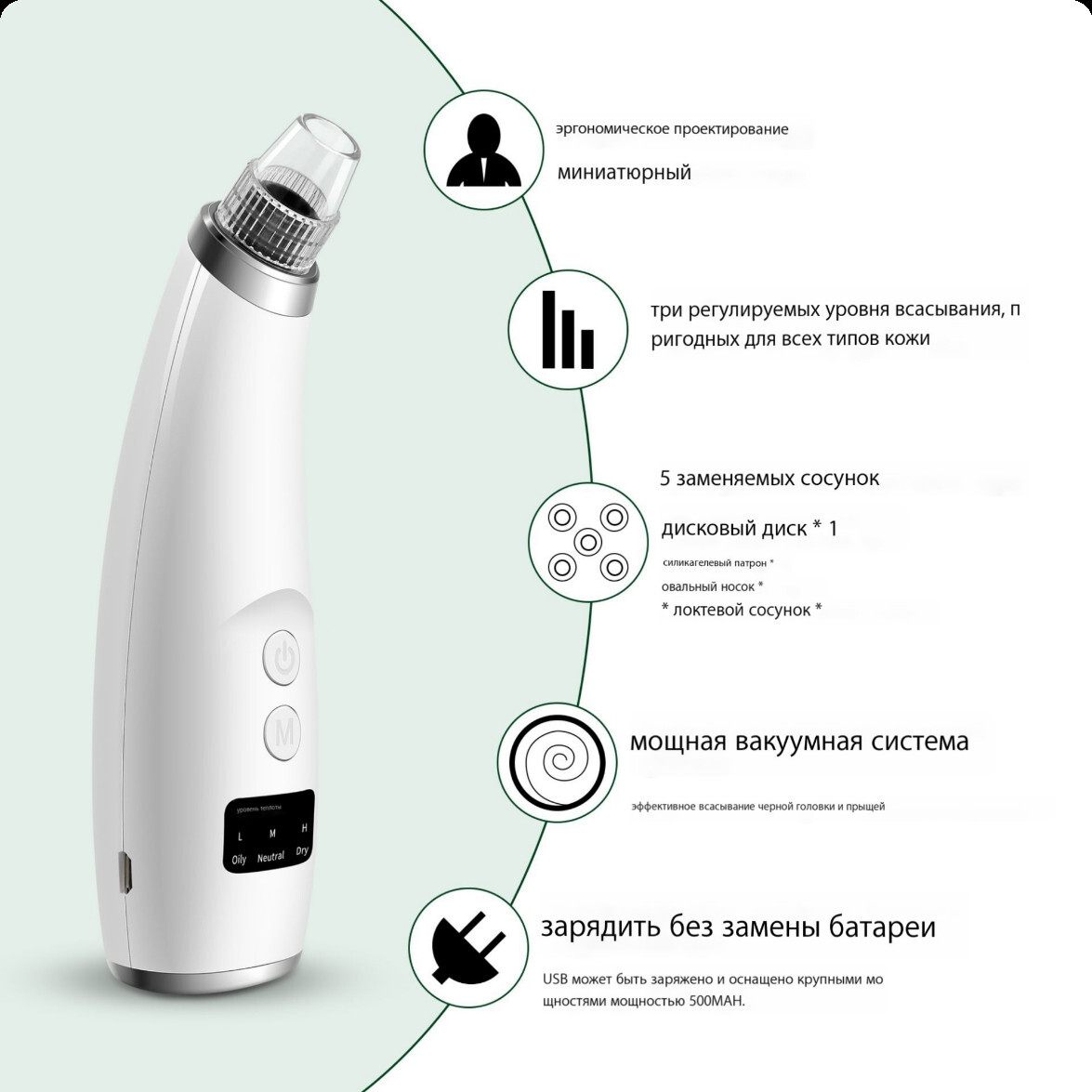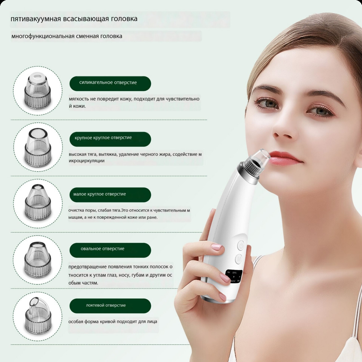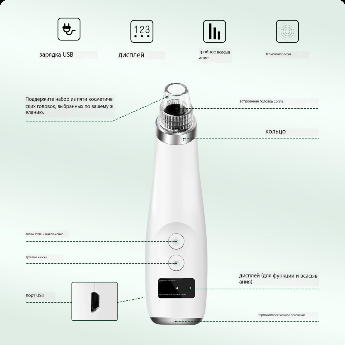 Насадки:4Комплектация:АксессуарыОсновной блок*1штВсасывающая головка*4штКабель для зарядки*1 шт.Инструкция по эксплуатации*1 шт.Описание:Описание продуктаОн использует технологию вакуумного всасывания для вытягивания угрей, жира и грязи из пор.Он также по
