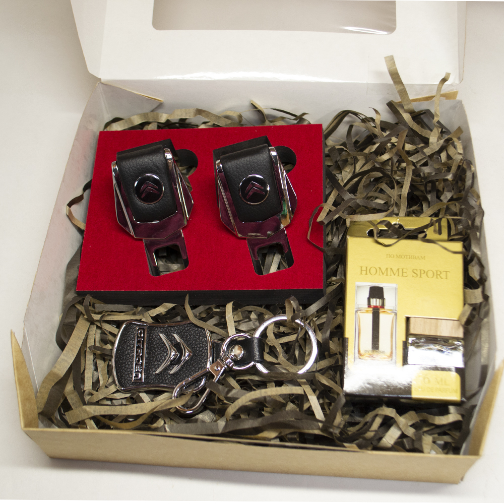 В подарочный набор входят:комплект заглушек с логотипомбрелок с логотипомароматизатор по мотивам Homme Sportкрафтовая коробка