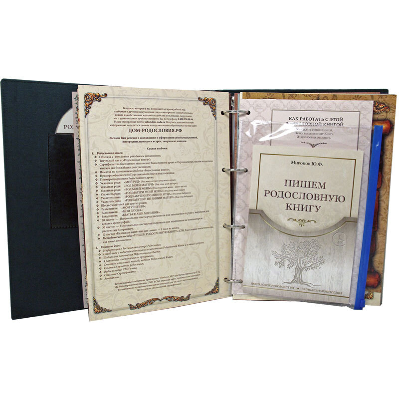 Комплектация:Блок для заполнения родословной книги (12 указателей родов, 50 бланков для заполнения персональных листов, 12 календарей памятных дат);Кольцевой механизм для изменения и добавления листов;Брошюра с описанием структуры и метода ведения родосло