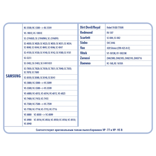 Дополнительная информациясоответствуют оригинальным типам пылесборников: vp-95b и vp-77