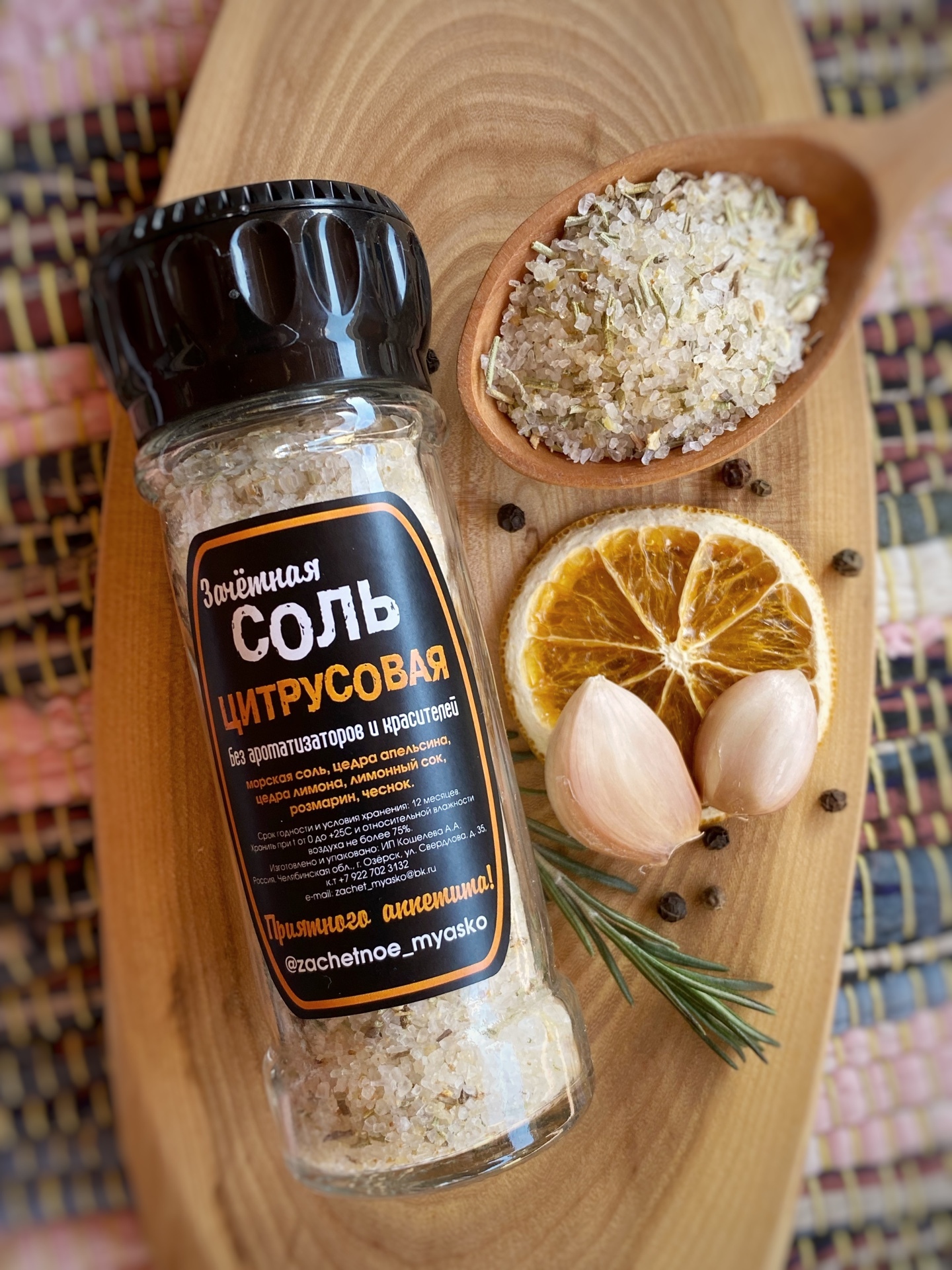 Состав:Ореховая соль, состав: морская соль (Израиль), концентрированный сок лимона, концентрированный сок апельсина, лимонная цедра, апельсиновая цедра, розмарин, чеснок. Прекрасно подходит для овощных салатов, блюд из морепродуктов и рыбы.Условия хранени