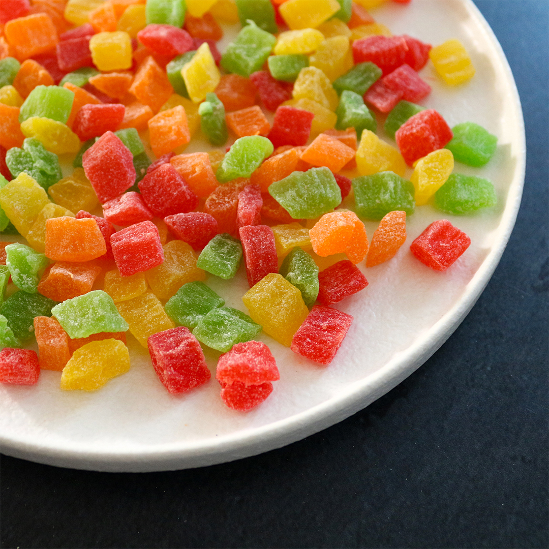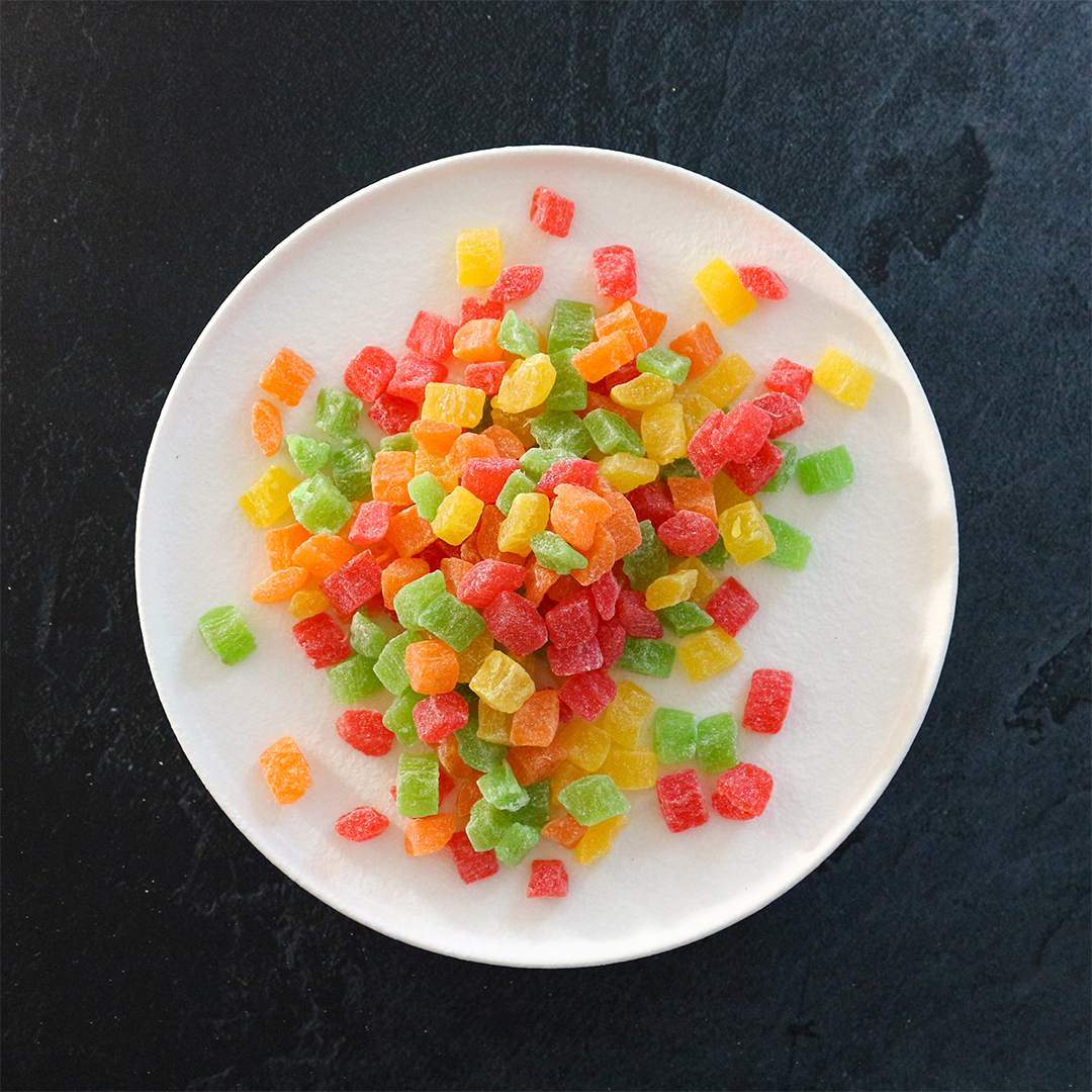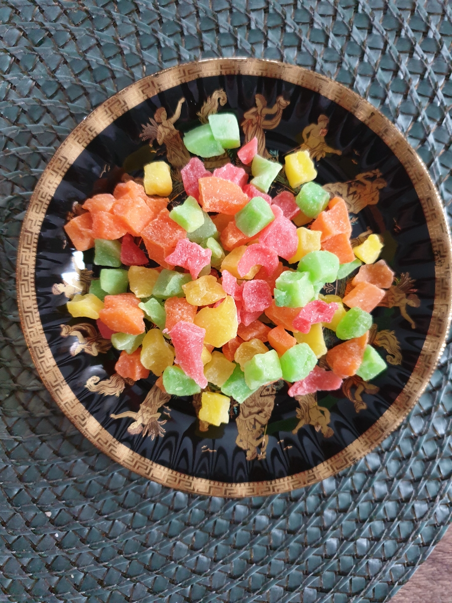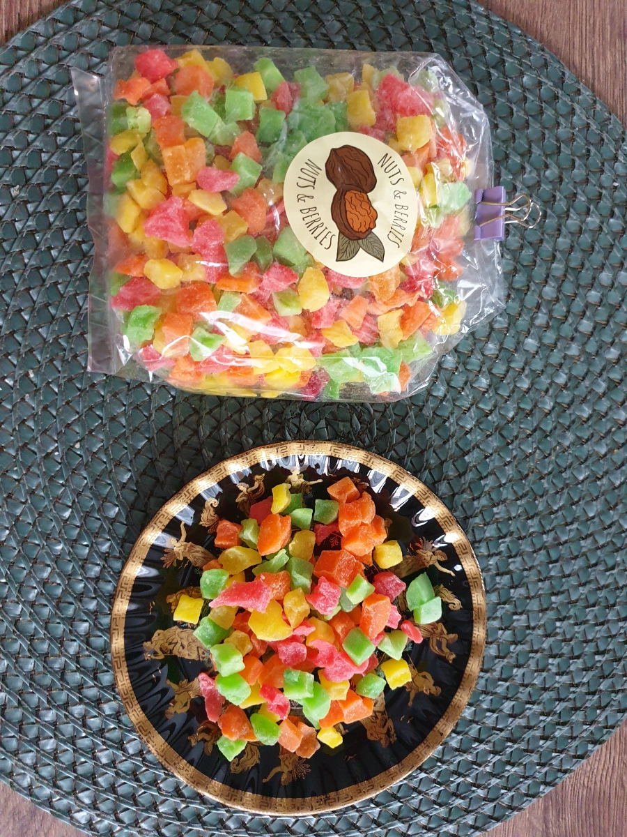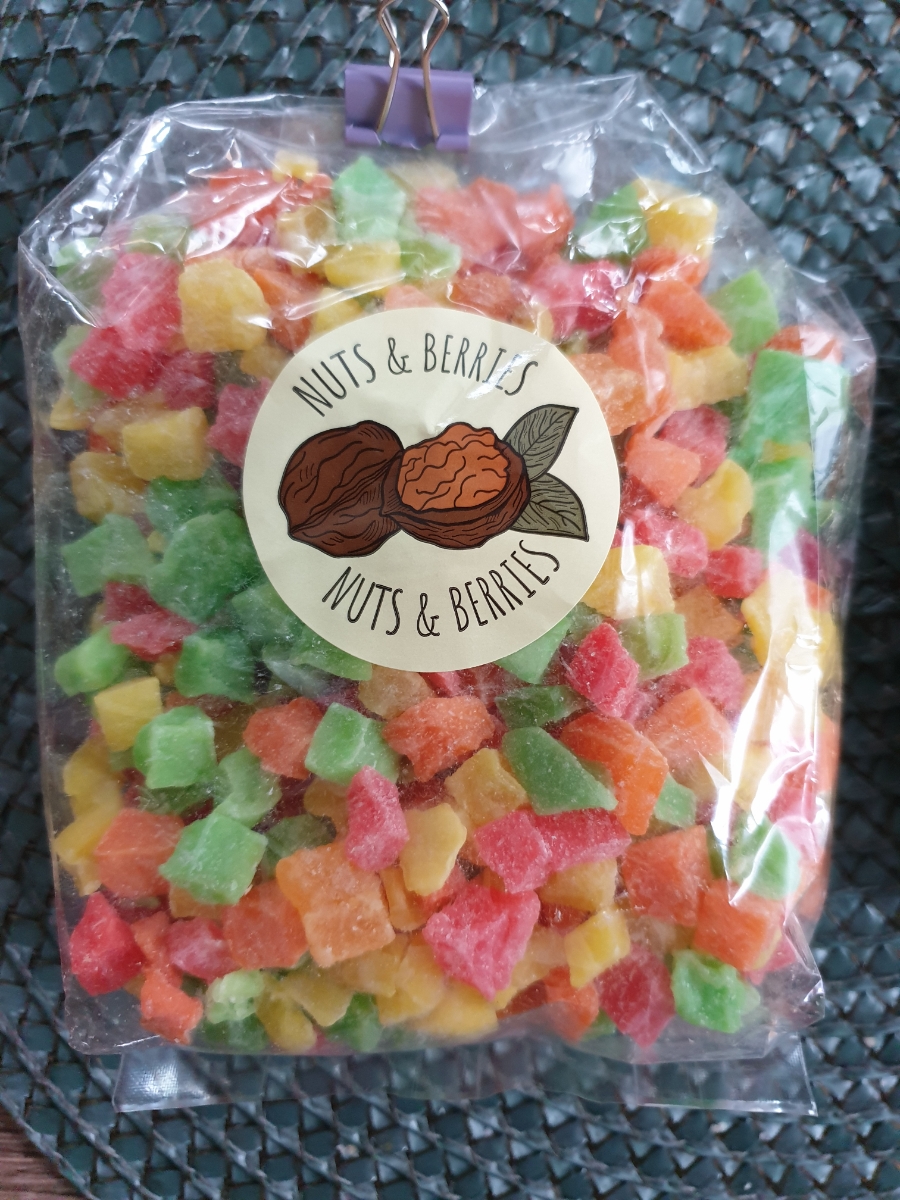 Цукаты-кубики от **Nuts&Berries** - ассорти кусочков фруктов, вываренных в сахарном сиропе и подсушенных в духовом шкафу. Основу микса составляют ананасовые цукаты. Вкус -для любителей классики -сладкий, но без притрного послевкусия, чуть с кислинкой. По