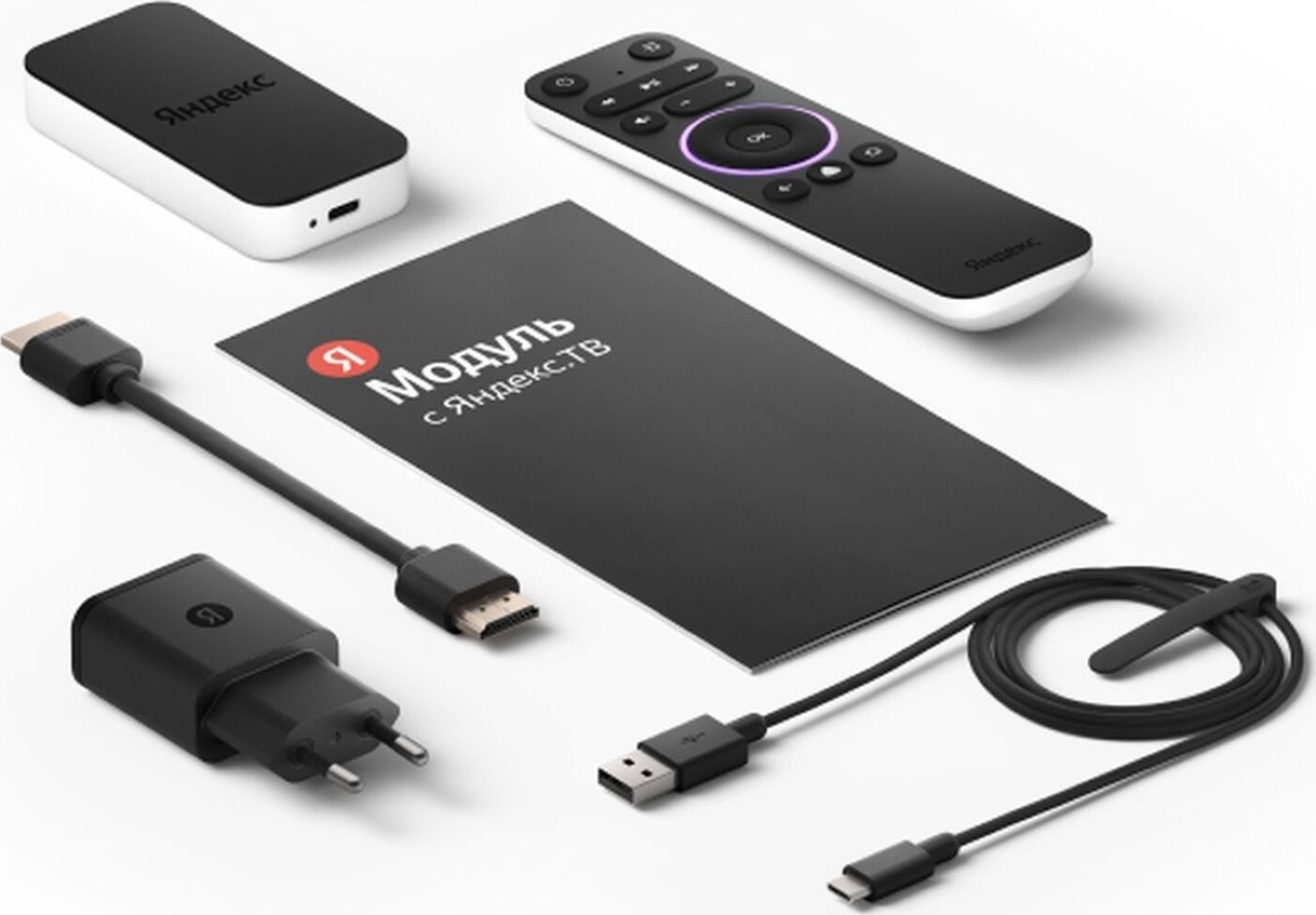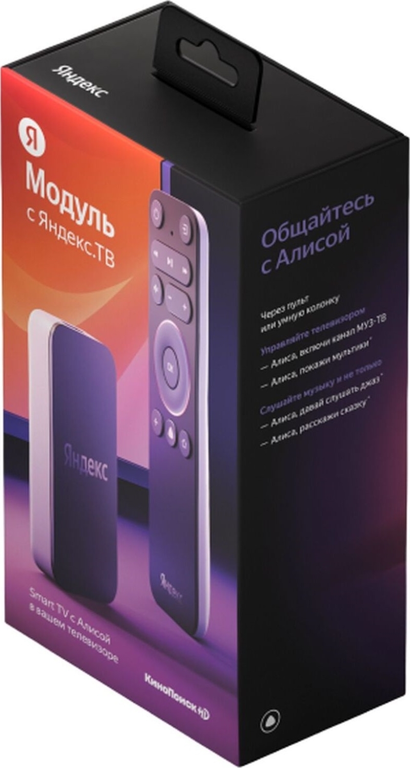 Комплектация:ТВ-приставка, пульт дистанционного управления, кабель питания USB Type-C, адаптер питания, кабель HDMI, руководство пользователяОписание:Модуль с Яндекс.ТВ – Смарт.ТВ с АлисойКомпактное устройство, которое сделает ваш телевизор умнее и добави